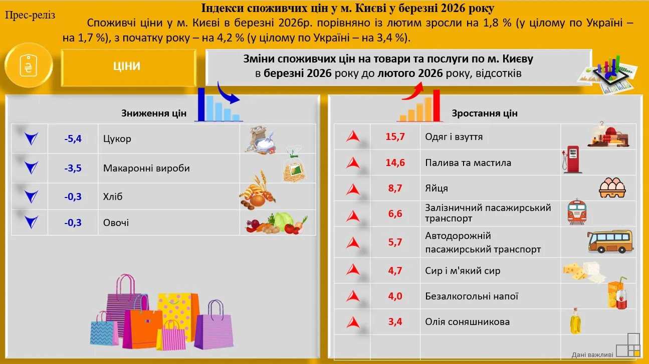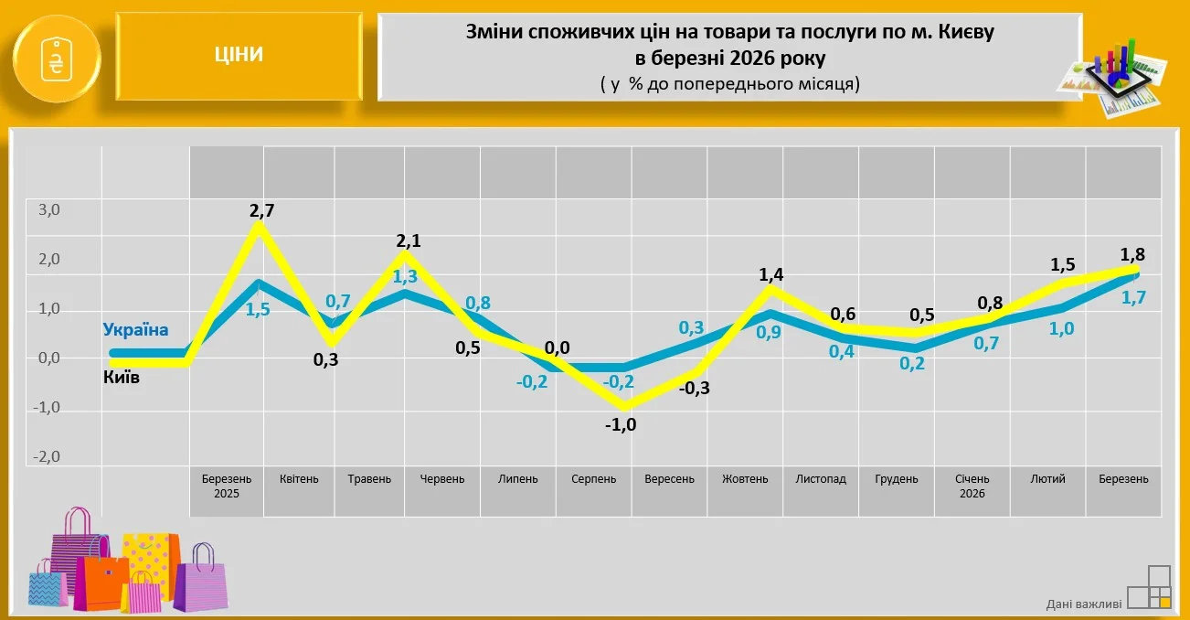 Індекс споживчих цін у Києві в березні 2026 року у порівнянні з лютим зріс на 1,8%. Таким чином інфляція в столиці перегнала загальноукраїнську, яка становила 1,7%. Про це повідомляє "NV Бізнес" з посиланням на дані Головного управління статистики в Києві.