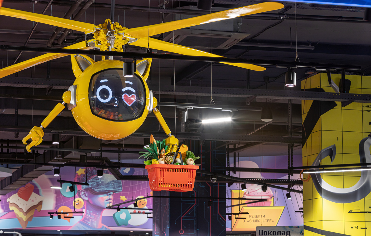 Концепція супермаркету занурює гостей у світ кіберкультури: від перших комп’ютерів до сучасного кіберспорту. Інтер’єр наповнений тематичними деталями: вхідну вивіску сформували з клавіш клавіатури, касові зони оформили як мікросхеми, а одна з кас має номер 404.