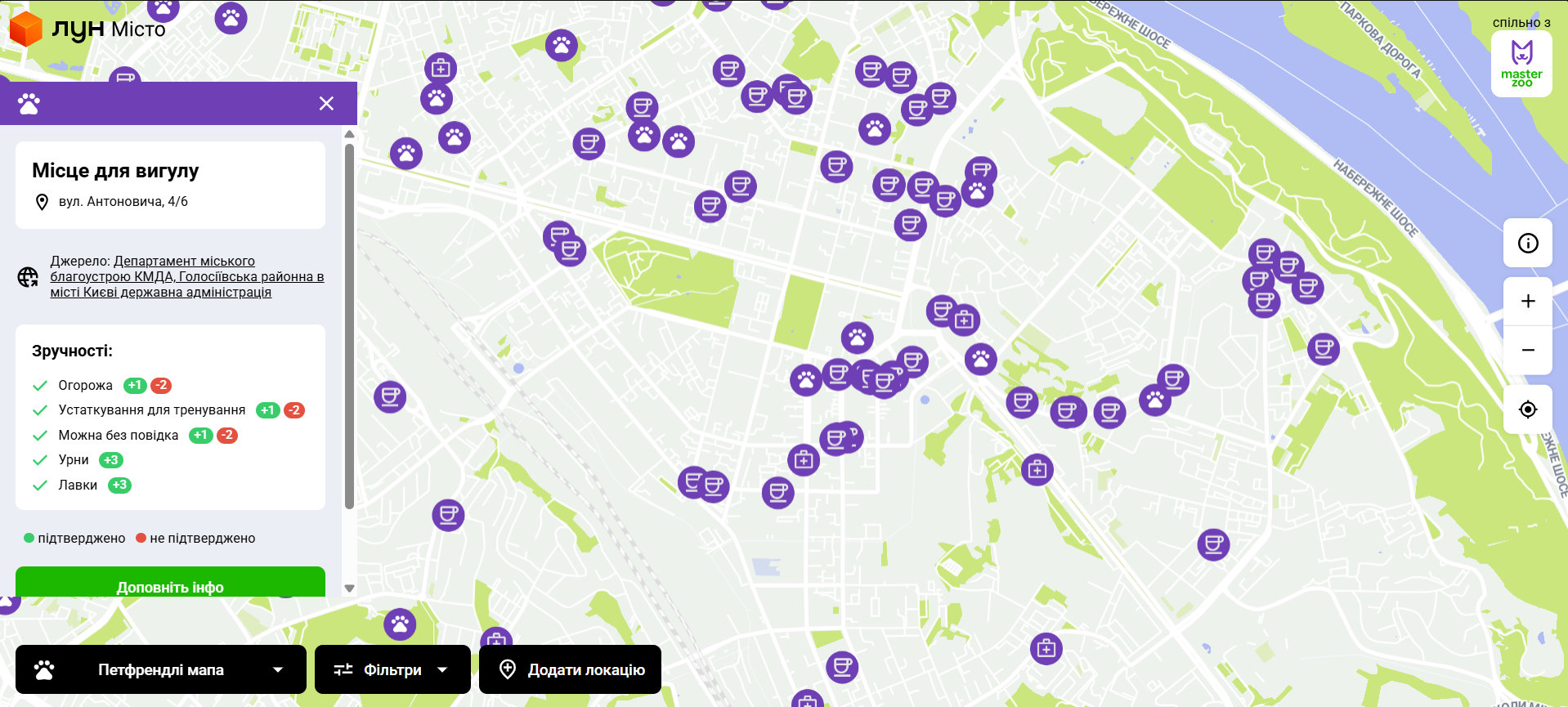 Компанія "ЛУН" спільно з мережею зоомаркетів MasterZoo представили оновлену "Петфрендлі-мапу Києва".