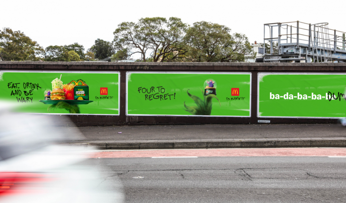 Крім слогана, змінили й рекламні білборди McDonald's. Тепер з них бажають нещасливих свят і закликають бути обережними під час їжі. У 16-ти локаціях по всій Австралії культові арки бренду стали тимчасово зеленими.