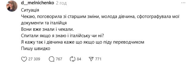 Днями в Threads розгорілася скандальна історія. Дар'я розповіла, що поверталася автобусом в Україну. Під час зупинки до неї підійшов один з пасажирів того ж рейсу — італієць, який їхав разом зі своєю дружиною українкою, — і зав'язав розмову. Спочатку, за словами Дар'ї, розмова була нейтральною, чоловік задавав багато питань. Потім він різко змінив тему і почав розповідати, як поважає путіна і що Україна — погана.