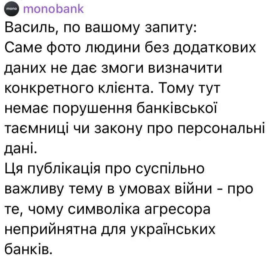 Саме фото людини без додаткових даних не дає змоги визначити конкретного клієнта. Тому тут немає порушення банківської таємниці чи закону про персональні дані, — відповіли в банку.