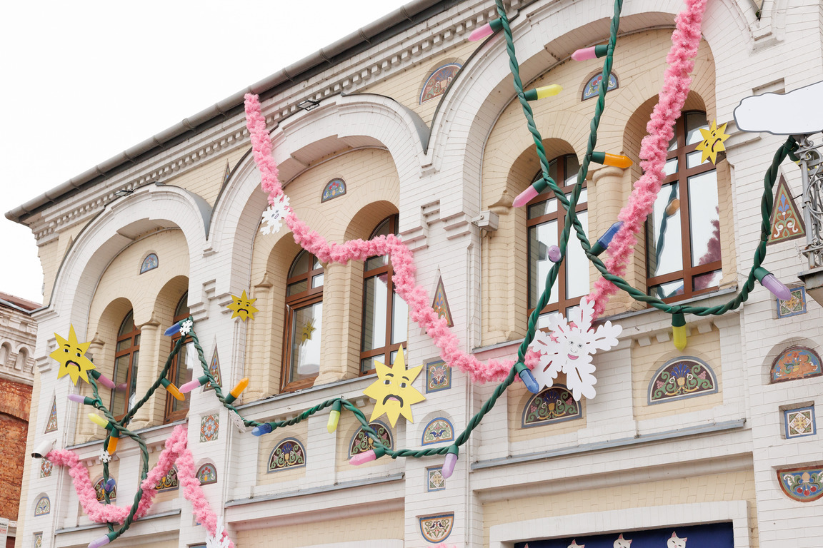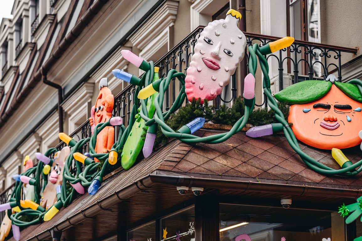 В Одесі на вітринах з’явилися традиційні символи Різдва в нестандартному вигляді: усміхнений імбирний чоловічок, весела кутя та надкушена корзинка. Фасад доповнено гірляндами, зірками та великими різдвяними прикрасами, а інтерактивна ілюстрована ялинка дозволяє гостям робити фото.