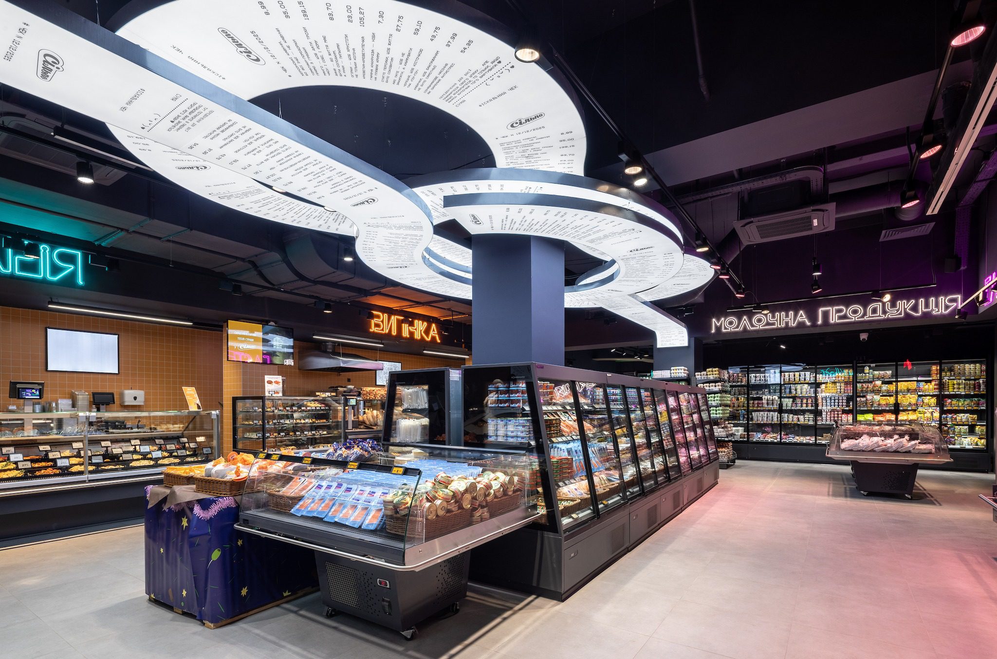 Вивіски відділів також стилізовані під лабіринти, а в центрі супермаркету розмістили головний артоб’єкт — чек "Сільпо".