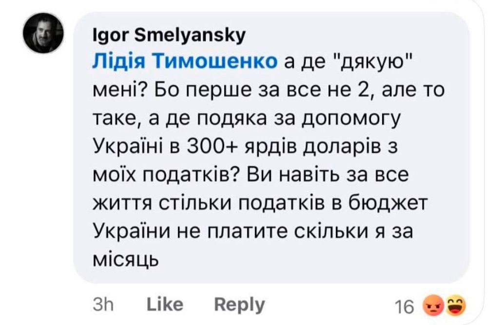 А де подяка за допомогу Україні в 300+ ярдів доларів із моїх податків? Ви навіть за все життя стільки податків до бюджету України не платите, скільки я за місяць, — написав Смілянський у відповіді одній із користувачок.