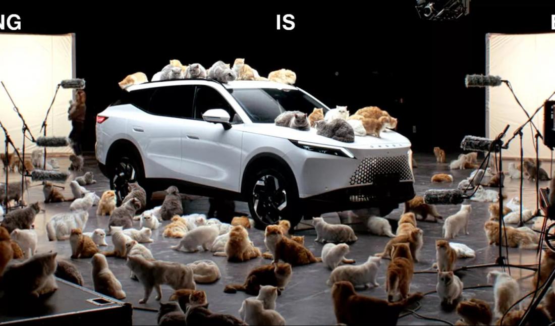 Щоб продемонструвати шумопоглинаюче скло позашляховика, компанія Omoda залучила десятки пухнастих кішок, які лазили по ньому, захоплено муркочучи зовні, залишаючись при цьому абсолютно нечутними за кермом.