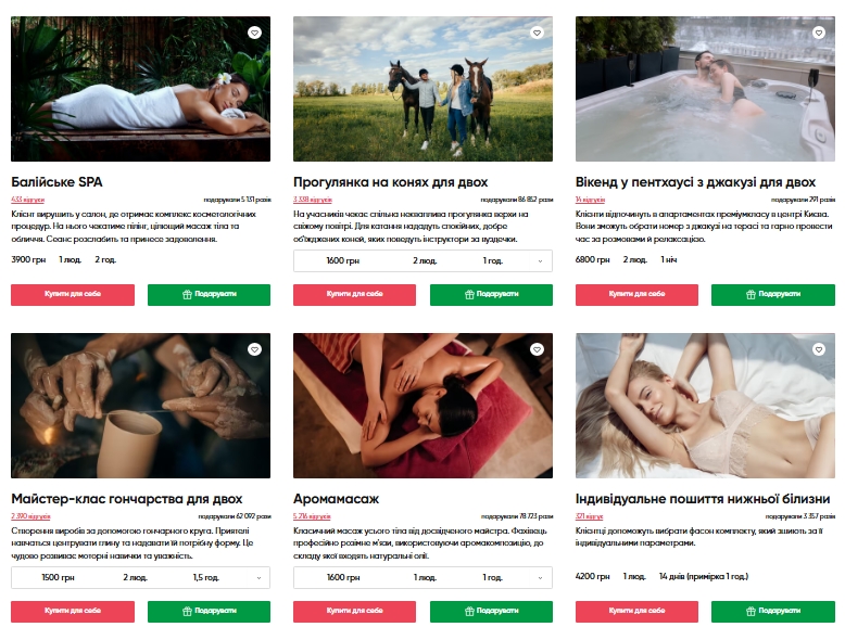 Пропонує такі подарункові сертифікати на 8 березня, як “Балійське СПА”, “Прогулянка на конях для двох”, “Аромамасаж”, “Індивідуальне пошиття білизни”, “Майстер-клас гончарства для двох”, “Фотосесія” тощо.