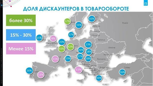 В Германии этому формату торговли принадлежит 42% рынка. Дискаунтеры открывались крупнейшими мировыми ритейлерами (оптовыми торговцами) — Wal-Mart, Delhaize le Lion, Lidl & Schwarz и др. Среди самых известных сетей дешевых торговых точек — немецкие Lidl, Norma, Aldi, Penny Market, Plus. Сегодня в Украине в этой области можно вспомнить крупных двух игроков — АТБ и Auchan. Эти сети продают не только товары по низким ценам, но и обычный ассортимент.