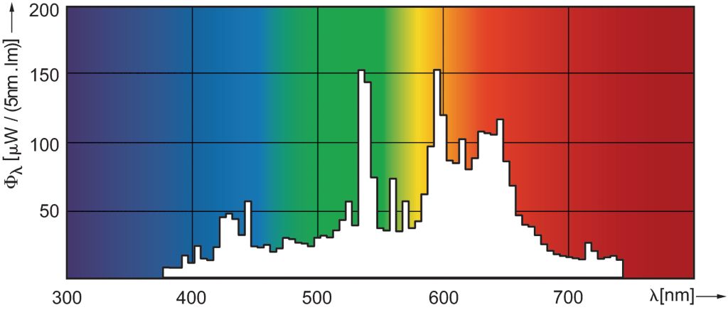 Если в радуге от лампочки, которую мы поставим, самой яркой и широкой полоской будет синяя, мы получим эффект, обратный красному. Синий спектр — враг торговли. Рецепторы, воспринимающие синий цвет спектра, стимулируют активность тех участков мозга, задачей которых является блокирование эмоциональных позывов что-либо купить. Кроме того, именно синий цвет спектра блокирует выработку в организме гормона мелатонин, расслабляющего нас и открывающего дорогу легким эмоциям и, как следствие, продажам. Ответственные производители к основным характеристикам своих ламп обязательно добавляют так называемую спектральную кривую, в которой можно увидеть, какие спектры максимально присущи конкретной лампе. Данная характеристике света требует особого внимания при выборе светодиодных световых приборов, ведь белых светодиодов в природе нет. Белый светодиод получается при напылении вещества специального химического состава в синий светодиодный кристалл. Это вещество переводит часть его синего спектра в другие, и мы видим белый свет. Но синяя полоска в радуге по-прежнему будет самой широкой и яркой.