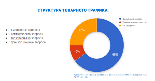 Мы решили делать акцент на товарный трафик. Выяснили, что 65% товарного трафика — это смешанные запросы, то есть запросы, по которым в выдаче присутствуют несколько типов ресурсов, к примеру: коммерческие сайты, интернет-магазины, инфопорталы, агрегаторы, сайты производителя.