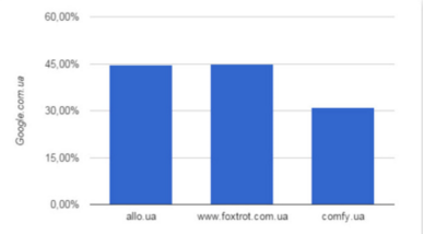 В результате ссылочной стратегии и внутренней оптимизации по категорийным запросам Allo.ua имеет уровень видимости 45%: