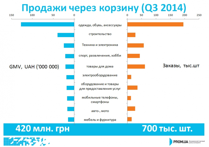 В третьем квартале 2014 года через корзину на Prom.ua было выполнено 700 000 заказов на общую сумму 420 млн гривен. Среди ТОП-категорий и по количеству заказов и по обороту с большим отрывом лидирует категория «Одежда, обувь, аксессуары».