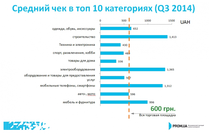Средний чек покупок на Prom.ua в третьем квартале 2014 года составил около 600 гривен. Другие категории с самыми высокими чеками это: «Строительство», «Электрооборудование» и «Мобильные телефоны, смартфоны».