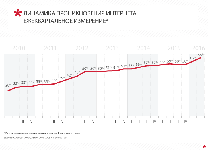 Доля украинцев в возрасте 15+, использующих интернет хотя бы раз в месяц, уже достигла 66%. Об этом говорится в исследовании Factum Group, проведенном во втором квартале 2016 года. Если за предыдущие три года проникновение интернета выросло на 8 процентных пунктов, то за последние три квартала доля регулярных интернет-пользователей прибавила еще столько же, увеличившись с 58 до 66%.