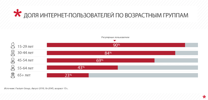 Как результат, в более молодых возрастных категориях 15–29 лет доля регулярных интернет-пользователей уже сравнялась с долей телезрителей, а в категории 30–44 года очень быстро приближается к показателям ТВ.