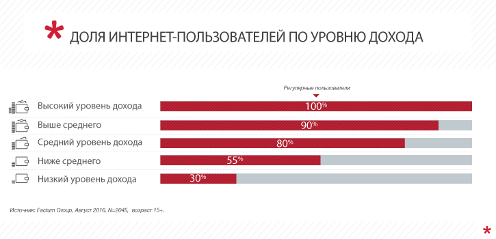 Распространение 3G сделало доступ в онлайн для этой категории еще более удобным и повсеместным. Это отчетливо видно по приросту мобильной аудитории в возрасте 30–45. В результате практически 100% платежеспособной аудитории являются регулярными интернет-пользователями.