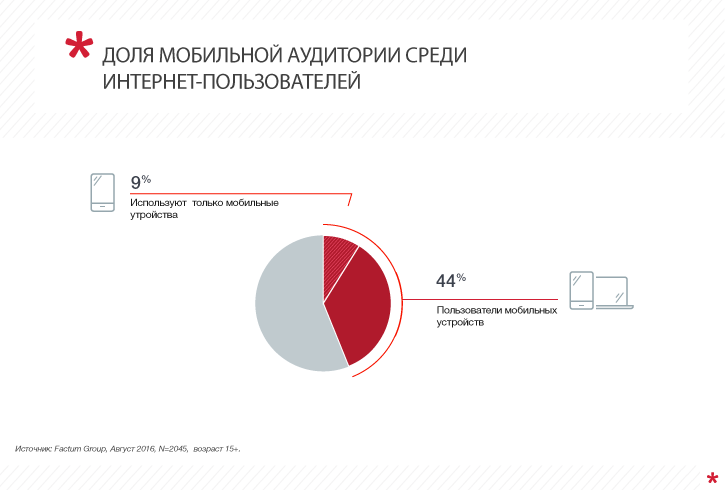 Важной тенденцией стал быстрый рост количества пользователей, которые заходят в интернет исключительно с мобильных устройств. На сегодняшний день таких пользователей уже 9%, или почти 2 млн человек.