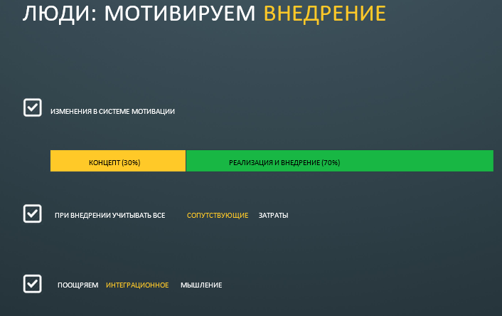 Мы мотивируем на инновации и сразу оговариваем бонусный фонд: за концепт 30% (проработанный бизнес-план) и 70% за внедрение.