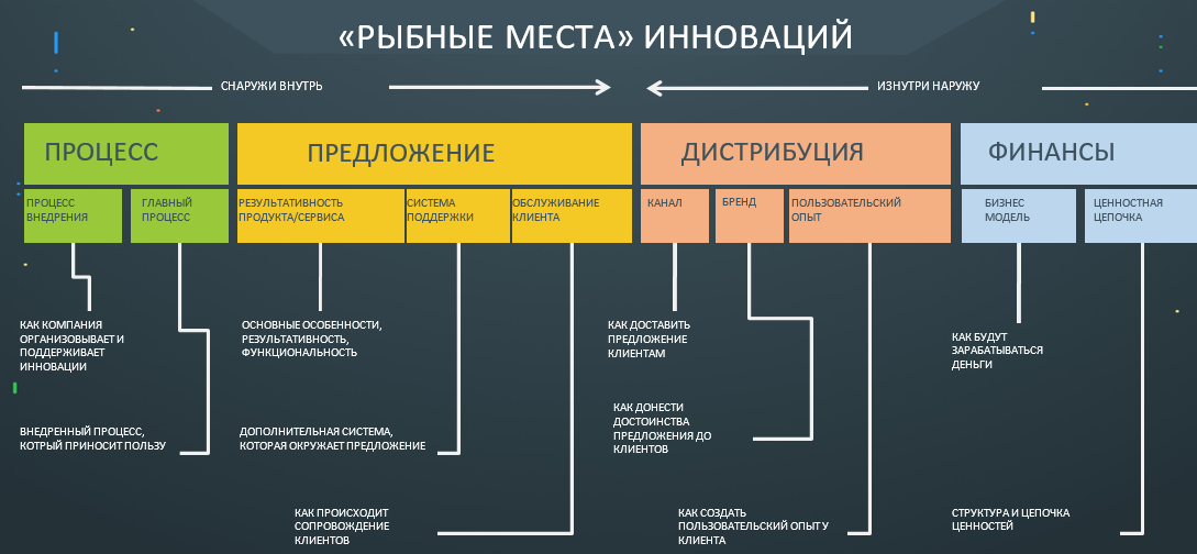 Есть 10 моделей инноваций. Автор одной из книг об инновациях сделал фреймворк, который позволяет любой бизнес разложить на составляющие: взять свою цепочку ценностей, все процессы, которые задействованы в создании продукта и подумать, на каком этапе можно создать инновацию.