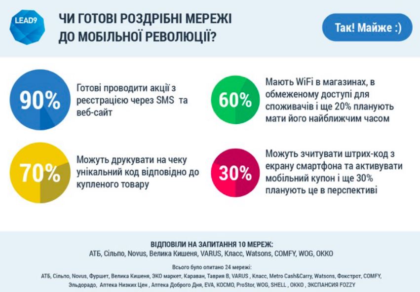 В начале 2016 года в LEAD9 подвели итоги исследования «Готовы ли ритейлеры к мобильной революции». Целью было понять, насколько активно сети используют WI-FI и СМС. На вопросы ответили «АТБ», «Сільпо», «Новус», «Велика кишеня», «Варус», «Класс», «Ватсонс», «Комфи», «Вог», «Окко».