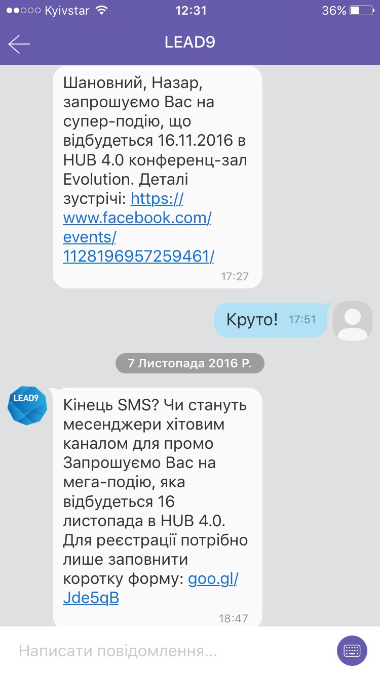 4. Рассылка LEAD9 участникам Public Talk «Конец эры СМС? Станут ли мессенджеры хитовым каналом для промо?».