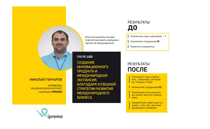 Для меня показательным примером является Николай Гончаров, основатель международной компании IPromo. После проекта он разработал уникальный продукт на рынке, открыл филиалы компании в США и Польше, а также привлек инвестиции в свой бизнес на сумму $1 млн. Что меня больше всего поразило, так это готовность учиться и узнавать новое. Владелец IT-бизнеса, чья компания обслуживала мировые заказы более 20 стран, таких крупных компаний, как, например, “Coca-cola” - увидел возможность сделать свой бизнес системнее и организованнее. Лично я считаю это примером того, как нужно развиваться и расти.