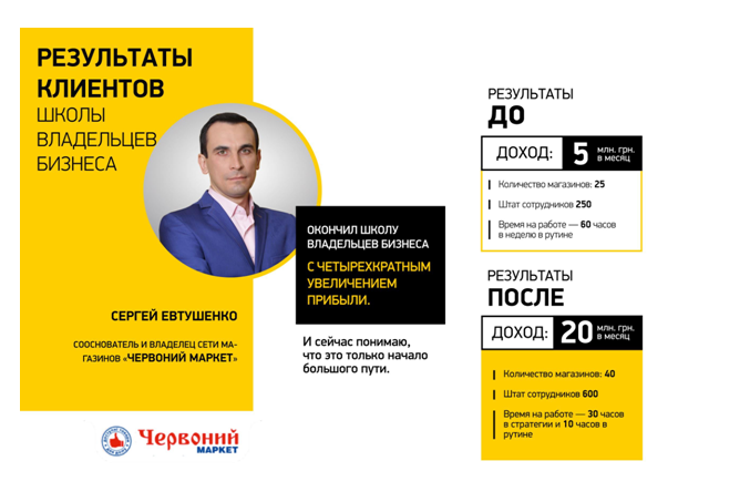 Компания Сергея Евтушенко - сооснователя и владельца сети магазинов “Червоний Маркет” - увеличила свой доход в 4 раза, от 5 млн. грн. в месяц в начале проекта до 20 млн. грн. после проекта, также была разработана потрясающая стратегия выхода на рынки Китая и США, над реализацией которой сейчас активно работает вся компания.