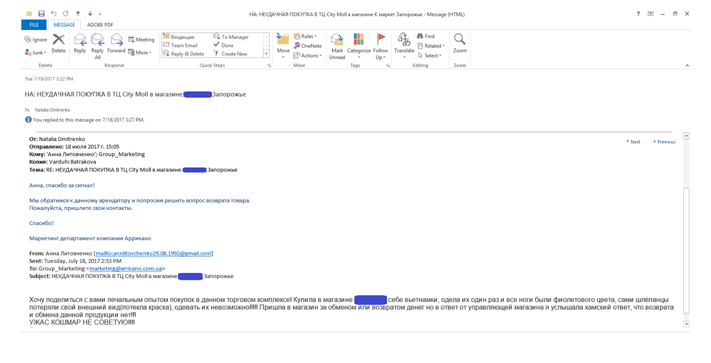 Запросы/жалобы/претензии покупателей, приходящие на общий почтовый ящик отдела маркетинга, требуют немедленной реакции. Кроме того, такие обращения могут приходить и в социальных сетях. Здесь важно сразу распознать, касаются они негативного опыта или позитивного. Работать с негативом необходимо срочно, ведь он может со скоростью света распространиться во внешний мир (мы все знаем, как быстро негативная информация работает в Фейсбуке), а это означает угрозу репутации бренда. Мы получаем время от времени разные обращения и стараемся отвечать на них немедленно. Как правило, покупатели всегда благодарны за быструю реакцию, и конфликтные ситуации решаются безболезненно. В случае, описанном ниже, проблема была устранена мирно. Маркетинг передал просьбу директору торгового центра, и вопрос возврата товара был решен, о чем покупатель нас позже уведомил и поблагодарил.