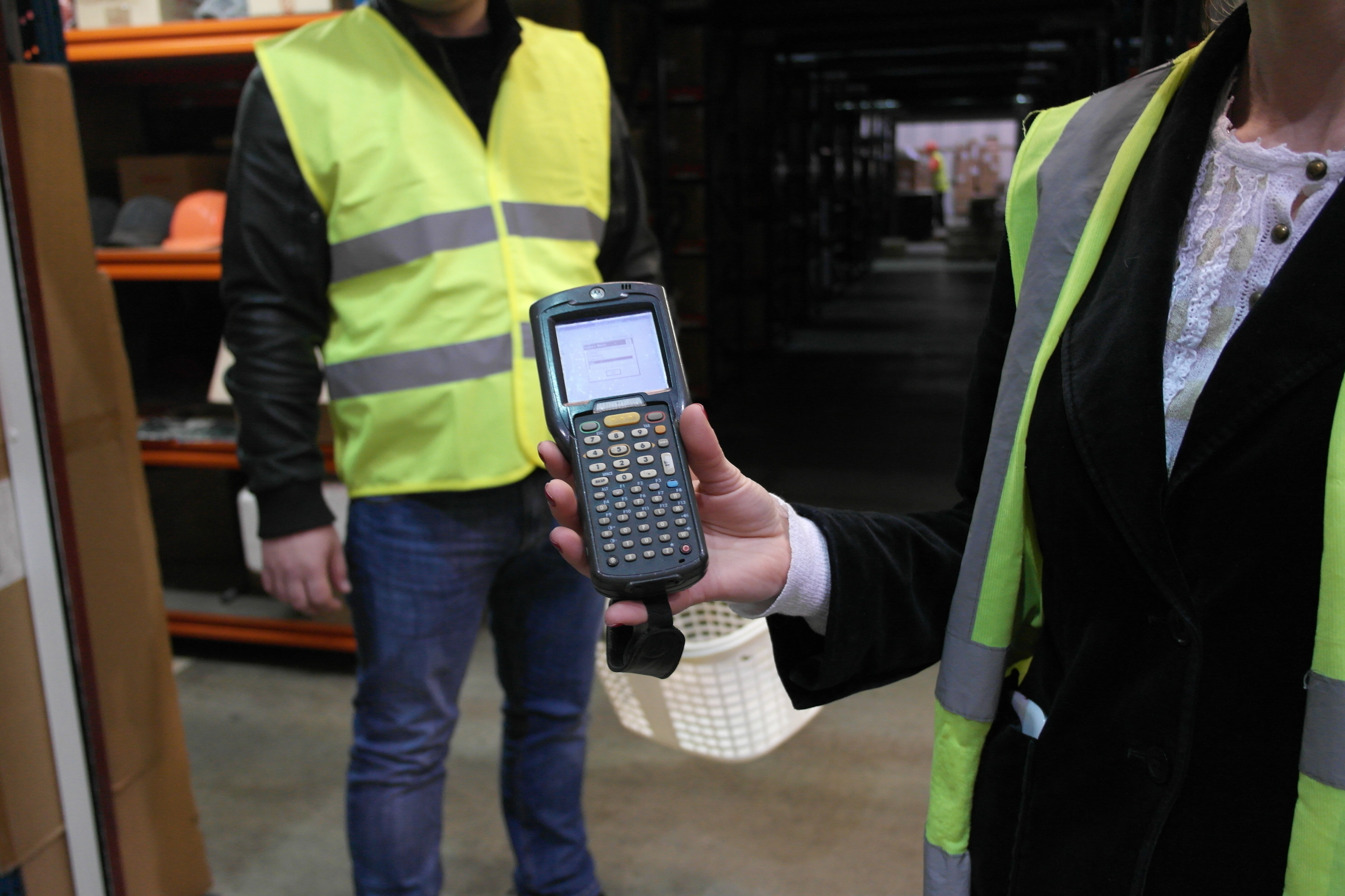 Все ячейки стеллажной конструкции промаркированы. Сотрудник сканирует ячейку, после чего открывает коробку и достает необходимое количество товара.