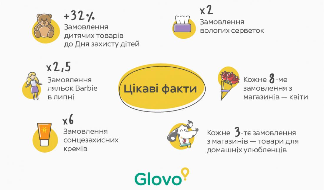 Сезонні товари. Від пекучого сонця користувачі Glovo рятуються сонцезахисними кремами — кількість замовлень цієї категорії виросла у 6 разів. Гігієнічні серветки ж стали замовлять у 2 рази частіше.