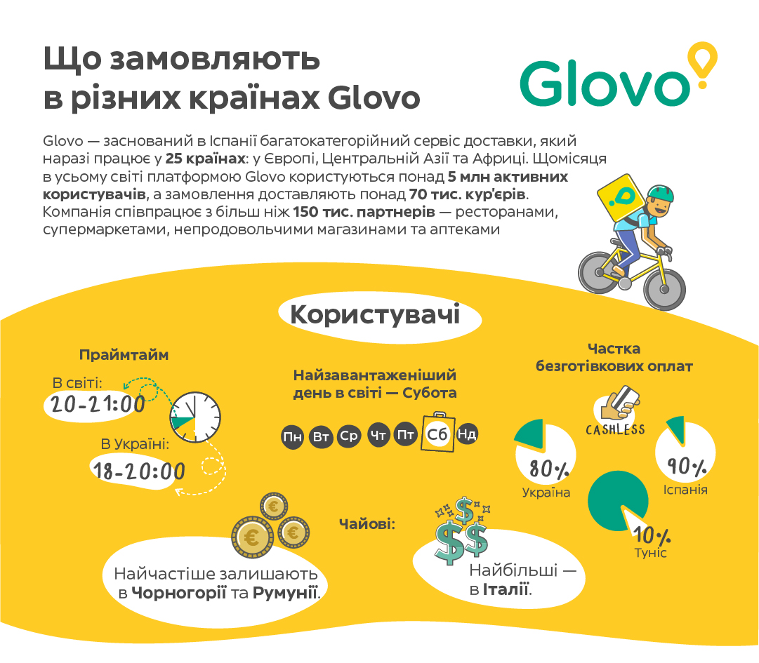 Glovo, заснований у 2015 році в Іспанії багатокатегорійний сервіс доставки, наразі працює у Європі, Центральній Азії та Африці. Щомісяця платформою Glovo користуються понад 5 мільйонів активних користувачів, а замовлення доставляють понад 70 тисяч кур’єрів. Компанія співпрацює з більш ніж 150 тисячами партнерів — ресторанами, супермаркетами, непродовольчими магазинами та аптеками.