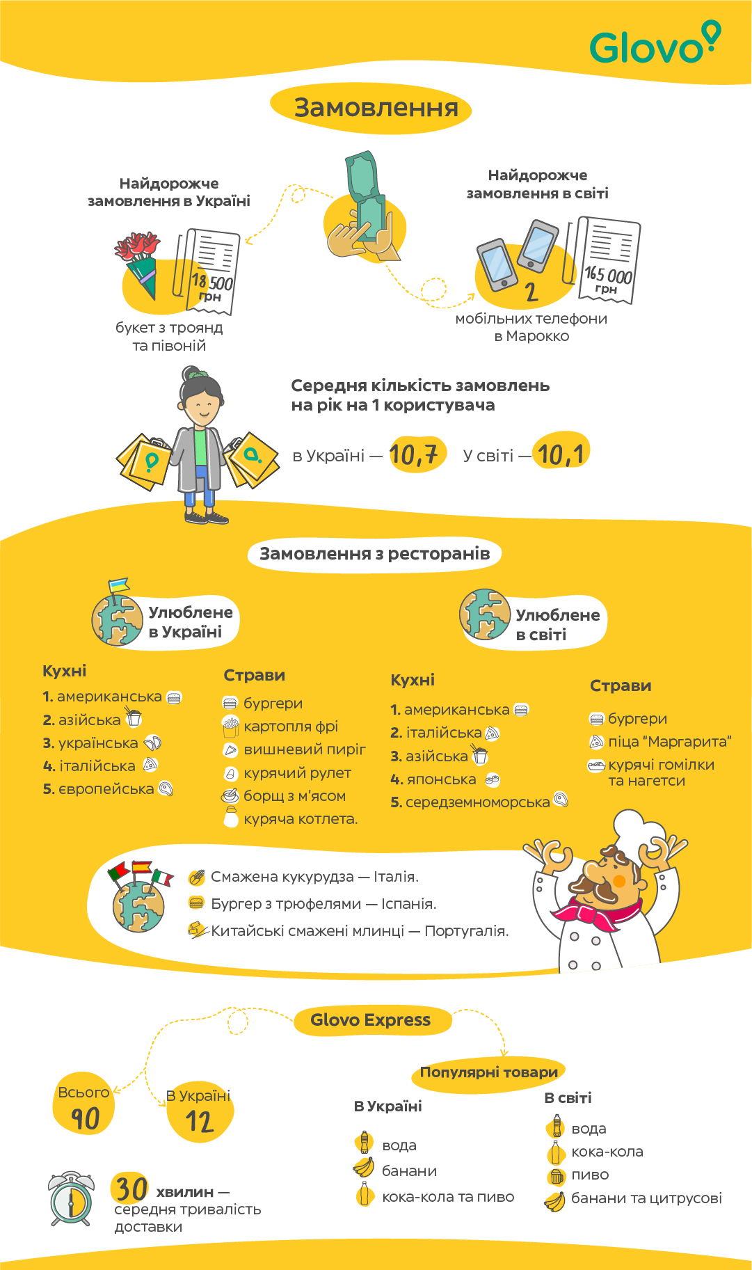 Серед улюблених кухонь користувачів Glovo в Україні та світі зустрічаються американська, азійська, італійська та середземноморська або європейська кухні. В Україні ще полюбляють національну кухню, яка піднялась ще на одну сходинку в топі й опинилась на третьому місці.