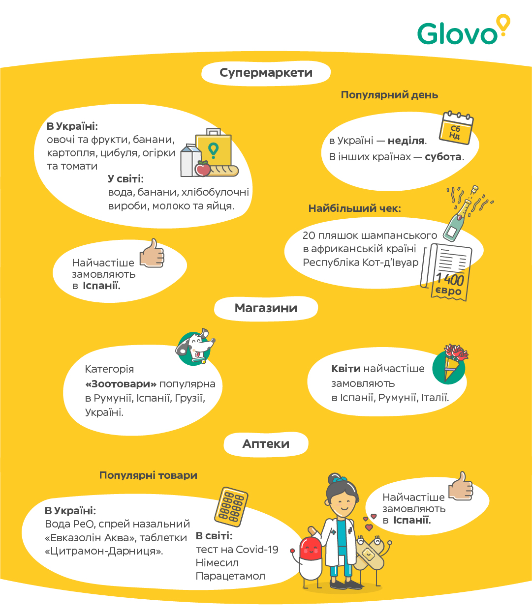 Якщо ж говорити про даркстори Glovo Express, мережа яких налічує 90 локацій у світі та 12 в Україні, то популярними товарами цього року стали вода, банани, кока-кола та пиво.