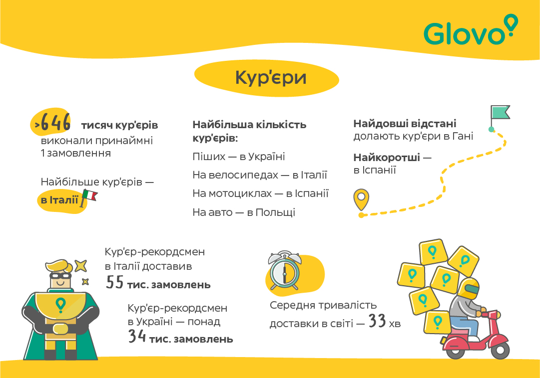 Середня тривалість доставки будь-якого замовлення через Glovo у всіх 25 країнах, незалежно від вибору транспорту, становить 33 хвилини. Найбільша кількість піших кур’єрів доставляє в Україні, кур’єрів на велосипедах — в Італії, на мотоциклах — в Іспанії, а на авто — в Польщі. Найдовші відстані долають кур’єри, доставляючи замовлення в Гані, а найкоротший шлях проходять замовлення в Іспанії.