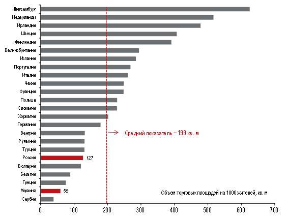 Существенное отставание рынков России и Украины по насыщенности торговыми площадями объясняется относительной неразвитостью рынков коммерческой недвижимости по сравнению с другими странами Европы. Активное строительство качественных торговых центров на территориях обеих стран началось только в последнее десятилетие, и пока сосредоточено только в наиболее крупных городах.