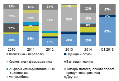 В первом квартале 2015 года спрос на логистические и складские помещения в Киевской области преимущественно формировали предприятия, которые работают в сфере логистики и перевозок, а также компании розничной торговли. Кумулятивная доля этих компаний составила 70% от общего объема помещений, сданных в аренду в течение периода.