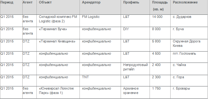 В первом квартале 2015 года почти все договоры аренды в сегменте складской и логистической недвижимости в Киевской области были подписаны в национальной валюте, без привязки к доллару США. В то же время некоторые арендодатели идут на уступки в виде скидок на арендные платежи, чтобы удержать тех арендаторов, договоры аренды с которыми были подписаны в период до начала 2015 года.