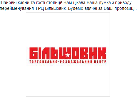 На своей страничке в Facebook и на сайте ТРЦ «Большевик» задал вопрос о том, какое новое название ему подойдет: «Уважаемые пользователи. Рассмотрим Ваши предложения по переименованию ТРЦ «Большевик».