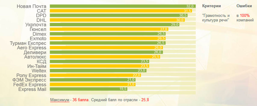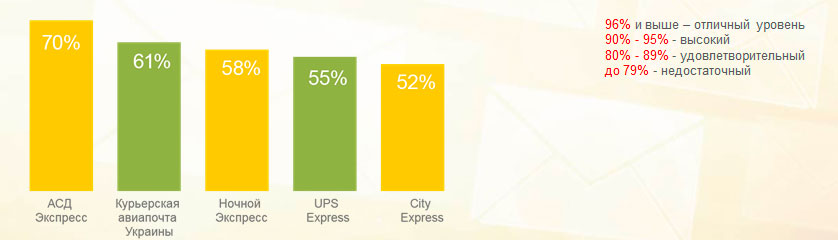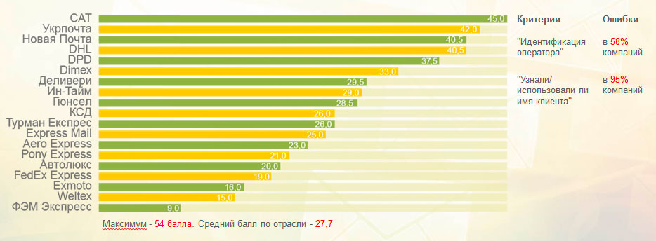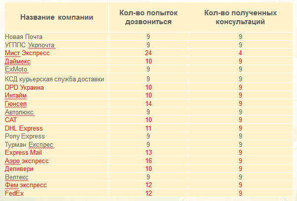 Лучшие результаты показали CAT, «Укрпочта» и «Новая почта». «Мист Экспресс» не включили в этот и другие рейтинги по категориям, поскольку в компанию было тяжело дозвониться.