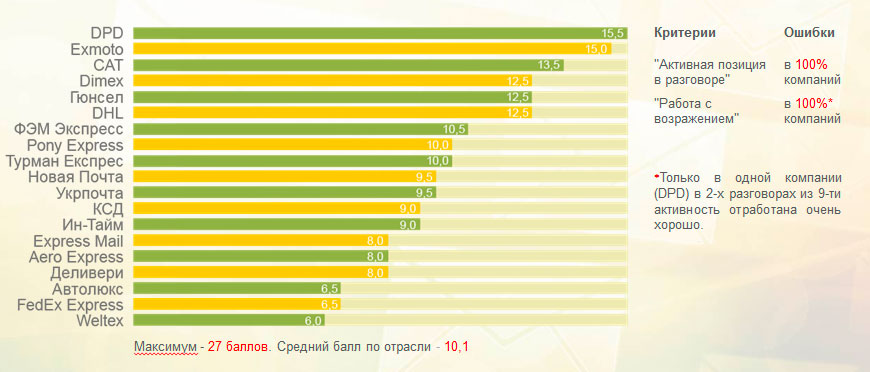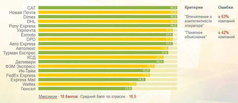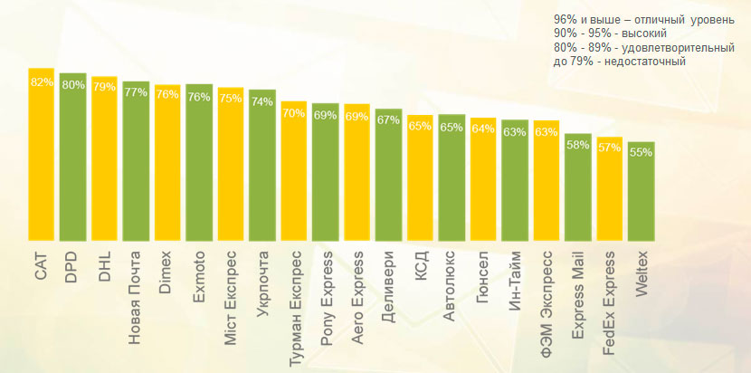 В тройку лидеров вошли DPD, Exmoto и CAT. «Новая почта» и «Укрпочта» заняли, соответственно, 10 и 11 места.