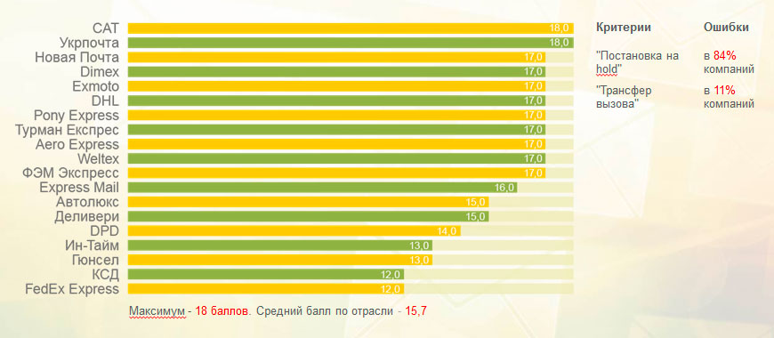 Крупнейший оператор в области почтовой логистики — госкомпания «Укрпочта» — не вошла даже в топ-5 по качеству телефонного обслуживания, заняв седьмое место в рейтинге с результатом 74% из 100%. «Новая почта» заняла четвертую позицию (77%), а «Мист Экспресс», операторы которого оказались самыми недоступными — шестую (75%). Лидером рейтинга стал САТ с результатом 82% из 100%.
