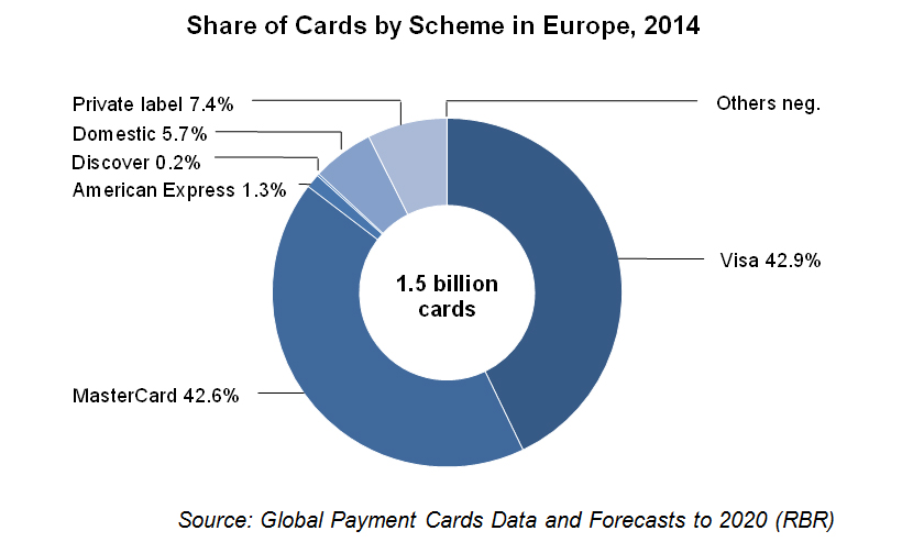 Системы MasterCard и Visa обслуживают почти 86% всех платежных карт в Европе. Об этом говорится в докладе исследовательской компании RBR. В конце 2014 года в Европе насчитывалось 1,5 млрд платежных карт в обороте, через которые прошло EUR2,9 триллиона. EUR9 из EUR10, потраченные в Европе с помощью пластика, были списаны с карт Visa или MasterCard