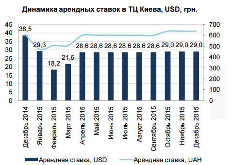 Начало 2015 года характеризовалось техническим снижение арендных ставок, в связи с серьезным скачком курса валют. Начиная со 2 кв. ставки стабилизировались на отметке в 28,5$. По итогам года средняя арендная ставка в торговых центрах Киева для галереи моды (на помещения площадью 100–200 кв. м) составила $27,3 /кв. м/ мес. без учета НДС, что на 24% меньше чем средняя арендная ставка за 2014. Более того, арендодатели используют практику «индивидуальной договоренности»: краткосрочная фиксация курса доллара, компенсация ремонта, и т. д. Распространена схема оплаты с процентом от товарооборота — 2–5% для якорных арендаторов и 7–15% для операторов торговой галереи.