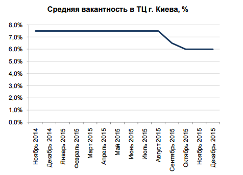 К концу 2015 года уровень вакантности снизился на 1,5% до уровня 6%. Это связано с началом стабилизации торгового сегмента и результатам налаживания отношений между арендаторами и собственниками ТЦ. Кроме того, в 2015 г. был выведен рекордно низкий объем торговых площадей (30 700 кв.м), несмотря на значительный объем торгового предложения, которое было заявлено, но перенесено на 2016 г. Также снижению вакантности способствовала относительная стабилизация курса национальной валюты и возможности получения арендаторами более выгодных условий аренды. Для некоторых розничных сетей этот кризис стал временем активного развития.