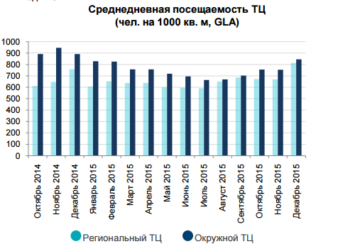 Среднедневная посещаемость киевских торговых центров по результатам 2015 года составила: для региональных ТРЦ 650 чел. на 1 000 кв. м GLA, для окружных ТЦ — 747 чел. на 1000 кв. м GLA. Средний показатель — 724 чел. на 1 000 кв. м. Следует отметить, что по итогам 2015 г. Произошло снижение среднего уровня посещаемости на 12%, при этом посещаемость окружных ТЦ сократиласть на 20%, а региональных на 1%, что говорит об устойчивости и востребованности данных форматов. Наиболее высокая посещаемость в лучших киевских ТЦ находится на уровне 30 000–40 000 человек в будние дни и до 60 000 человек в выходные.
