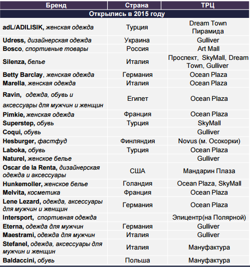 Не смотря на сложную экономическую ситуацию в стране, в частности на снижение платежеспособности населения, уменьшение товарооборотов ритейлеров, сокращение планов развития, мы наблюдаем положительную тенденцию и оживление рынка ритейла. На протяжении 2015 года дебютировали достаточно много новых брендов на украинском рынке, в списке которых фигурируют также украинские компании, что говорить о начале восстановления сегмента. В сложившихся условиях активно развивались украинские производители — они получили ценовое преимущество благодаря росту курса валют. К примеру, Ровенский льнокомбинат, который под маркой Goldi открыл за год около 10 магазинов. Среди иностранных активных сетей можно отметить LC Waikiki и Collin’s, которые продолжили развитие благодаря позиционированию в ценовом сегменте средний и средний минус Также продолжаются переговоры с рядом крупных международных операторов (H&M, Cotton, Defacto, и т. д.), которые не представлены на украинском рынке и выход которых может состояться в 2016–2017 гг. вместе с открытием новых масштабных проектов мегамоллов.
