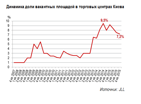 Доля вакантных площадей в киевских ТРЦ за IV квартал снизилась на 0,3 п. п. и 0,8 п. п. в целом за год — до 7,2%. Дальнейшая динамика показателя зависит от того, какие торговые центры будут открыты в 2016 году. «По нашим оценкам, при существующем уровне спроса в случае открытия всех заявленных на текущий год объектов доля свободных площадей на рынке торговых центров Киева достигнет 11–11,5%», — комментирует Марьяна Супчан, аналитик отдела исследований компании JLL (Украина).