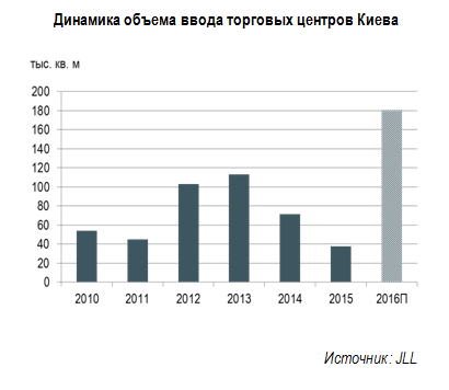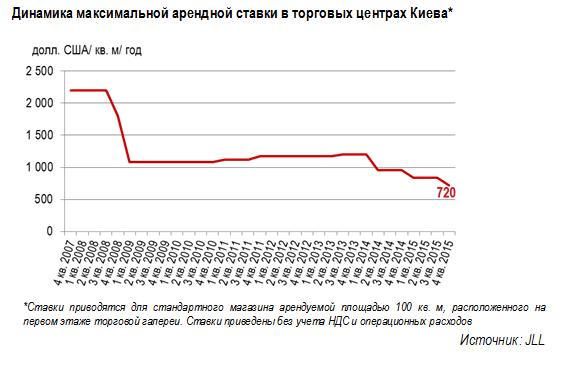 По оценкам экспертов компании JLL, верхняя граница арендных ставок в качественных торговых центрах Киева снизилась в 2015 году на 25% и достигла по итогам IV квартала $720 за кв. м в год (без учета НДС и операционных расходов) против $960 на конец 2014-го и $1 200 на конец 2013 года. Данная динамика объясняется девальвацией национальной валюты, произошедшей в начале 2015 года, и усилением давления на собственников объектов со стороны арендаторов