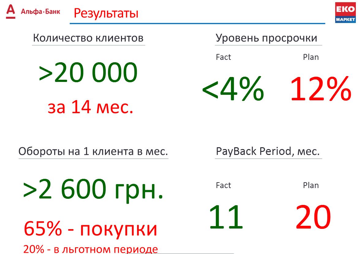 В 2014 году «Альфа-Банка» и «ЭКО маркет» выпустили кобрендовую кредитную карту. За 14 месяцев совместного проекта банк получил 20 000 клиентов, которые не просрочивают кредиты. Как сообщил вице-президент «Альфа-Банка» Алексей Пузняк, уровень просрочки по кредитам этих клиентов оказался меньше 4%.