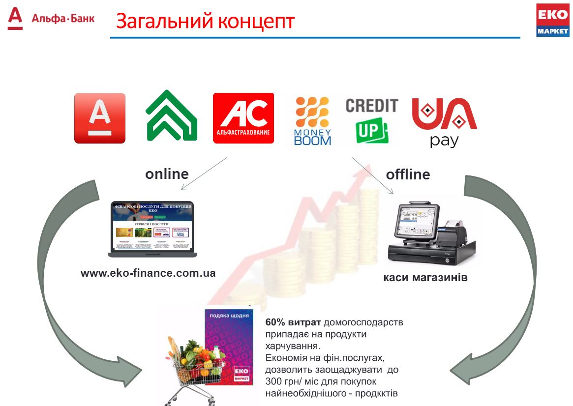 У «ЭКО маркета» подписан договор, но пока не отработан технический процесс с компанией UAPay по организации р2р-переводов. Уже стартовал проект с компанией «Альфастрахование», в рамках которого покупателям «ЭКО маркета» предлагается купить полис автострахования. Сервис по получению онлайн-кредита «ЭКО маркету» предоставляет компания «КредитАп». До конца года планируется внедрение еще трех финансовых продуктов.